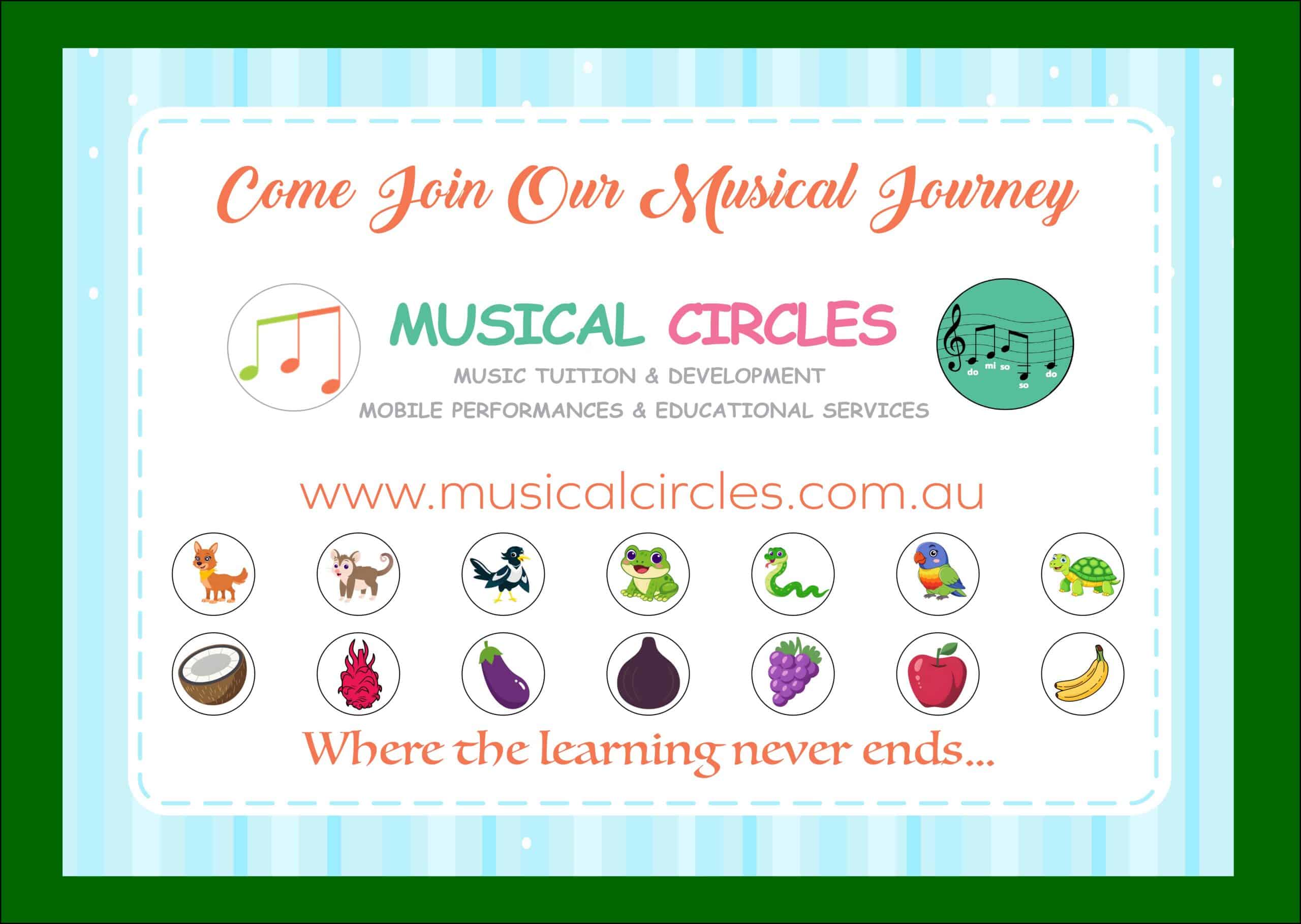 Includes Dingo, Ringtail, Magpie, Frog, Snake, Lorikeet, Turtle, Coconut, Dragon fruit, Eggplant, Fig, Grapes, Apple, and Bananas from ‘The Musical Alphabet Tree’ book.